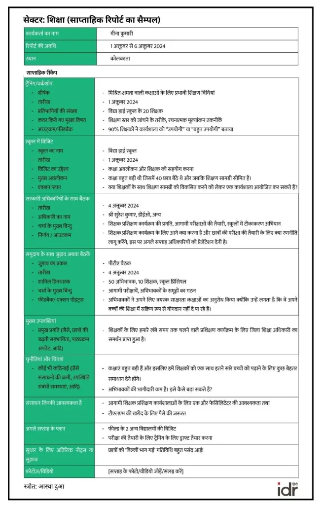 यहां पर उदाहरण के तौर पर शिक्षा सेक्टर के लिए एक टेम्पलेट साझा किया जा रहा है जिसके आधार पर आप अपनी दैनिक अथवा साप्ताहिक रिपोर्ट तैयार कर सकते हैं। रिपोर्ट को कैसे भरा जा सकता है, इसका उदाहरण दिखाया गया है।
